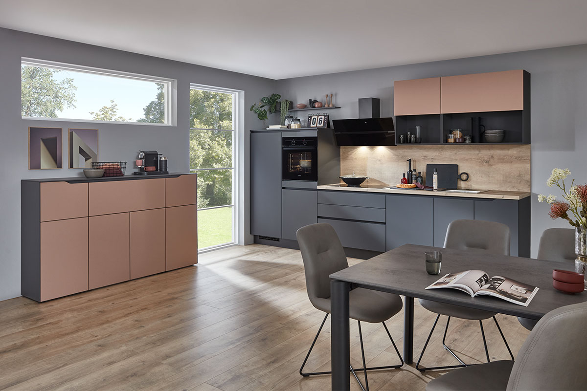 Trendige Küche mit Fronten in Lack, Koralle Premium matt und Lack, Schiefergrau Premium matt und einer Arbeitsplatte in Master Oak Nachbildung. Die Trendfarben schaffen eine elegante Atmosphäre, zudem bietet die Küche extra viel Stauraum, damit Sie Ihre Küchenutensilien ordentlich und griffbereit verstauen können. Perfekt für stilvolle und funktionale Räume. Mit Einbauspüle Edelstahl (RODI Una 34 N Manaus). Maße ca. 180 + 370 cm. B705469. (nobilia, Modell: Senso)