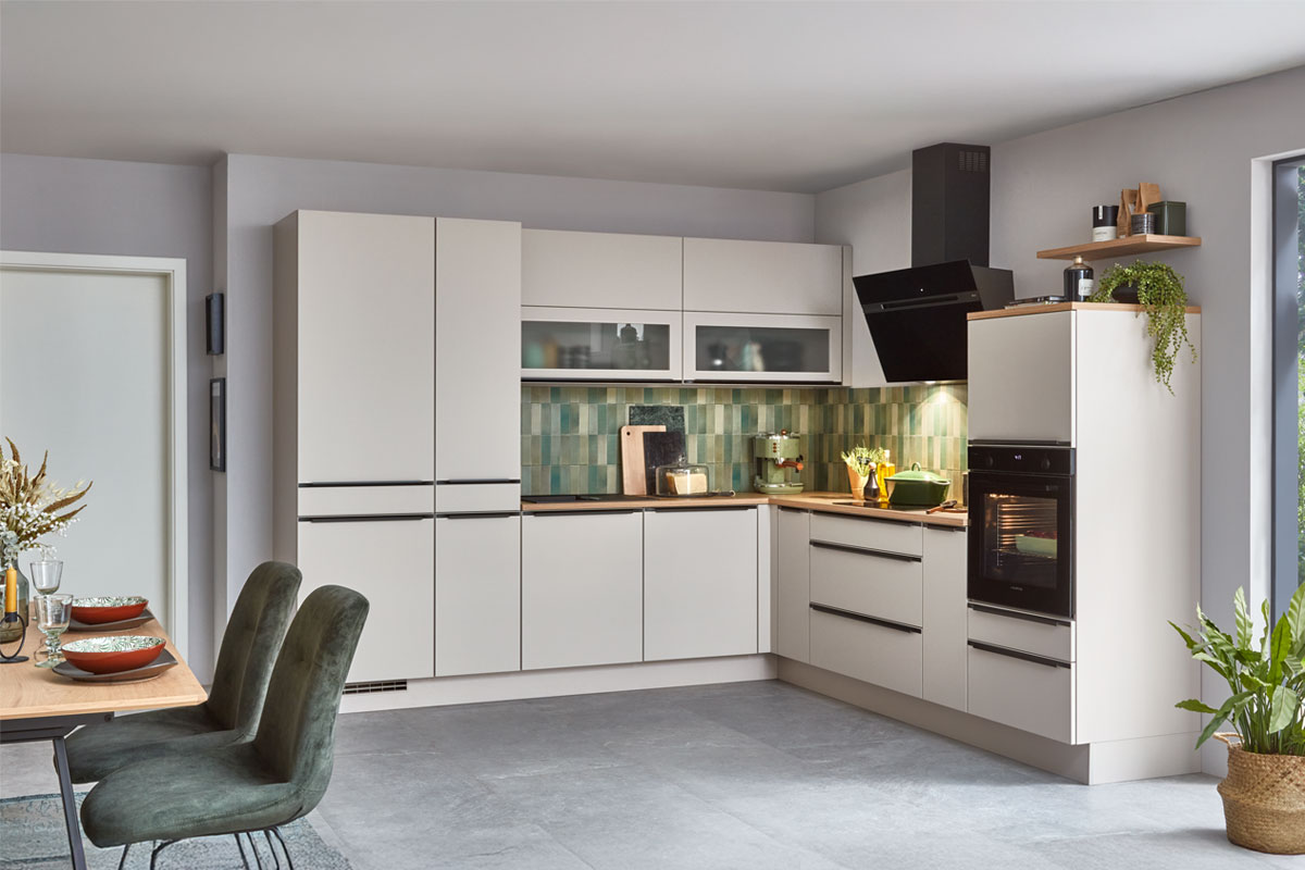 Eine kompakte Küche mit Fronten in Lack, Sand Perfekt matt und Arbeitsplatte in Eiche Honig Nachbildung. Die trendige Nischenrückwand im Dekor Fliese Vintage Grün setzt dabei einen individuellen Akzent und harmoniert zu einem frischen Gesamtbild. Glaseinsätze in den Wandschränken und das praktische Wandboard lockern das Design auf und bieten Platz für dekorative Details – perfekt für ein wohnliches Ambiente. Mit Einbauspüle Quarzkomposit (SCHOCK Mono N-100 Small, Magma). Maße ca. 285 x 275 cm. B705353. (nobilia, Modell: Softline)